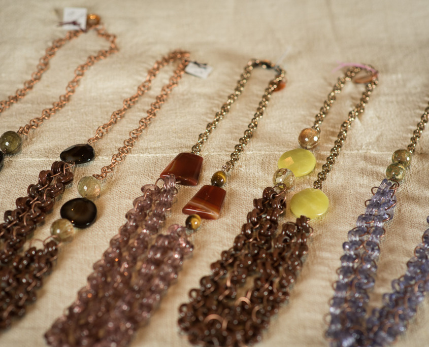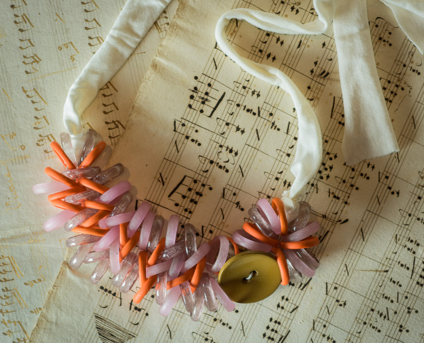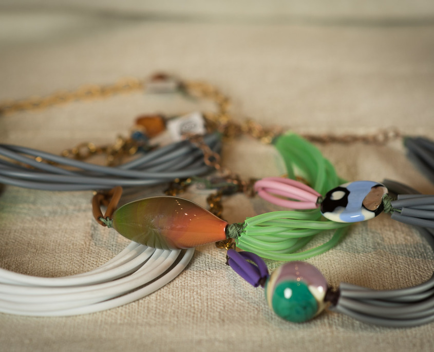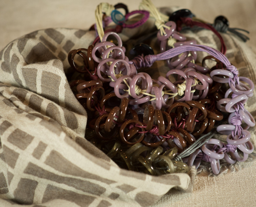 Chi ci segue dagli esordi ci ricorda per le collane di bottoni. Ma i nostri “pezzi forti”, quelli più venduti e indossati, quelli che da sempre vengono apprezzati ed esportati, sono i nostri modelli in vetro. La scelta iniziale è stata casuale: l’incontro, a Venezia, con degli anelli colorati che, guardati sotto una diversa prospettiva, diventano elementi da legare e annodare.