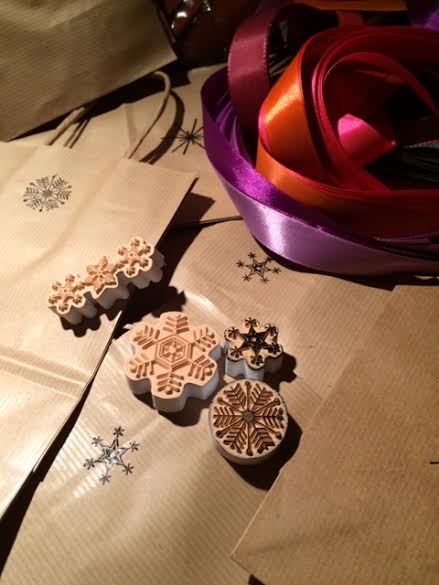 E allora perché non decorare a mano anche i sacchetti per le feste? Ed eccoci qua, come vecchi impiegati delle poste, a impregnare i nostri timbretti natalizi nell’inchiostro, e calcarli sui nostri sacchetti di carta affinché incidano la loro impronta festosa. Così quest’anno i regali di Arzigogolo che troveranno posto sotto l’albero avranno un ulteriore elemento distintivo!